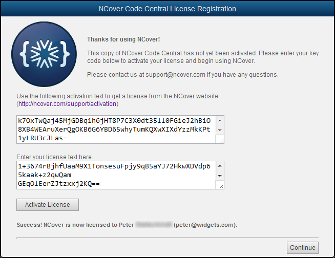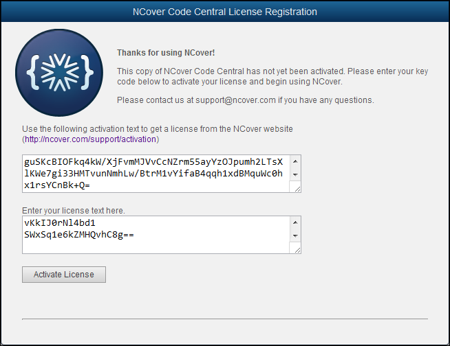 Go back to Code Central and paste the license text into the "Enter your license text here" field on the NCover License Registration window.