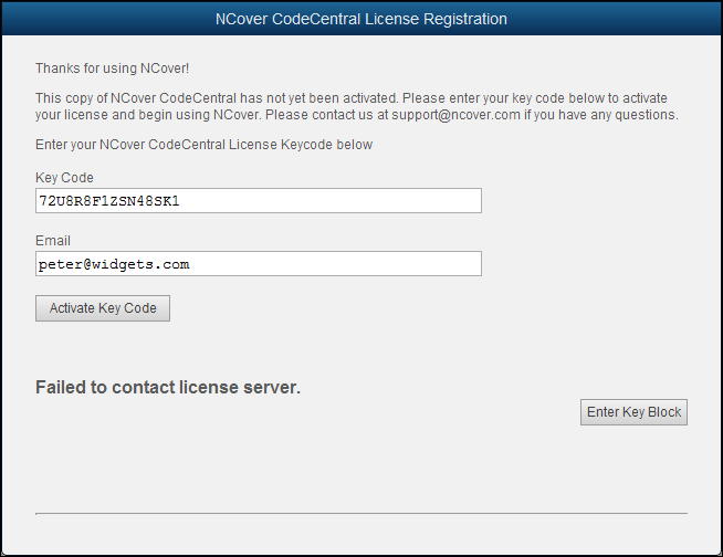 If the machine where Code Central is installed doesn't have the internet access needed to contact the NCover license server, there is an offline registration option.