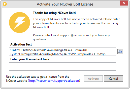Paste the activation text from NCover VS Extension into the "Paste your activation text here" field on the license activation web page.