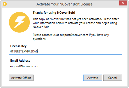 If the machine where Bolt is installed doesn't have the internet access needed to contact the NCover license server, there is an offline registration option.