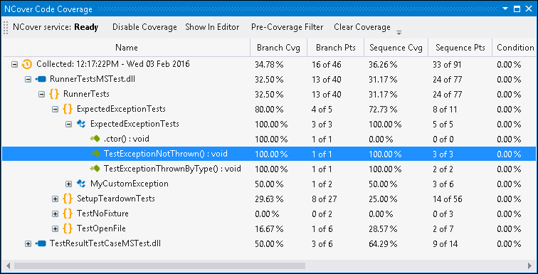To access this window, click on the NCover menu from the VS top menu, select View > Bolt Code Coverage. A dockable window will display, containing Branch Coverage, Sequence Coverage, and several other metrics in a tree-view.